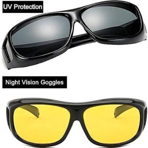 Driving Glasses Fit Over Glasses: sunglasses for women which are specially designed for eyeglasses wearer can be easily fitted with prescription glasses, and our fashion appeal and design features make our night driving glasses the most popular products for both men and women. please refer to our size chart before you make an order, measure your glasses size, if your glasses frame width and height is less than our driving glasses, then it will fit your glasses. UV400 Polarized Protection Lens: Night driving glasses for women are made of polarized yellow lenses and have UV protection. Our lenses are TAC polarized can effectively reduce glare caused by oncoming intense headlights and bright streetlights. A polarized yellow lens brightens your visual direction so as to help you see objects more clearly. Fit Over Design Flexible temples design,provide extremely comfortable fit. Polarized Yellow Lenses Polarized lenses can effectively eliminate glare from sunlight, rain, snow and lights. Restore the real vision and effectively protect your eyes. Can make your driving safety. UV400 Protection UV protection Glasses effectively block ultraviolet rays and glare to reduce headaches and eye strain while on the road. Make your driving safer and more convenient. …Quality is what you need Stylish look Proper fitting Best vision Best style HD quality vision dust proof eye protector Specification anti-reflective lens polarized HD Vision technology gives you clarity that you have never experienced Night Driving Sunglasses to “fit over” for your prescription eyeglasses, 63mm size will fit over medium to large prescription glasses. Check measurements for verification High defintion color-Fets Over prescription glasses UV400 Light weight & durable Black Shell Frame,Yellow Lens. Fets over prescription glasses